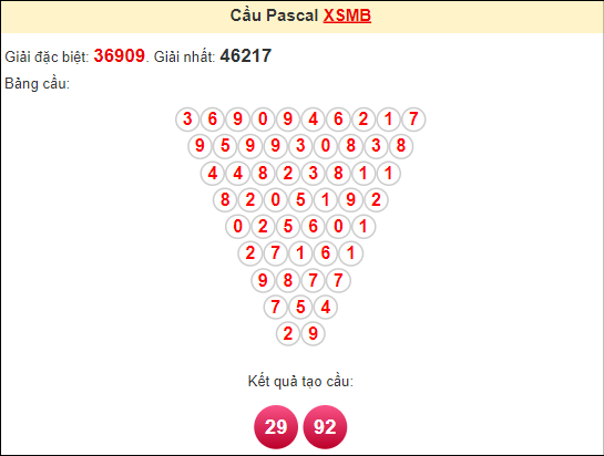 Kết quả từ soi cầu Pascale là cặp số may mắn: 29 92