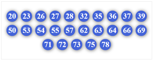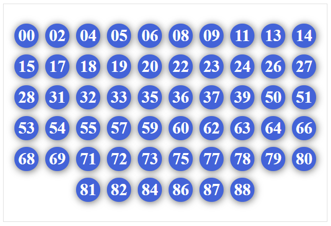00, 01, 02, 03, 04, 05, 06, 07, 08, 09, 30, 31, 32, 33, 34, 35, 36, 37, 38, 39
