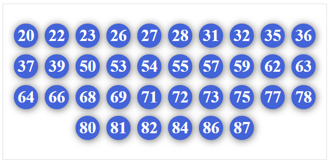 01, 02, 03, 04, 05, 06, 07, 08, 09, 30, 31, 32, 34, 35, 36, 37, 38, 39, 40, 41, 42, 43, 45, 46, 47, 48, 49, 50, 51, 52, 53, 54, 56, 57, 58, 59