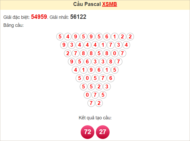 Kết quả từ soi cầu Pascale là cặp số may mắn: 72 27