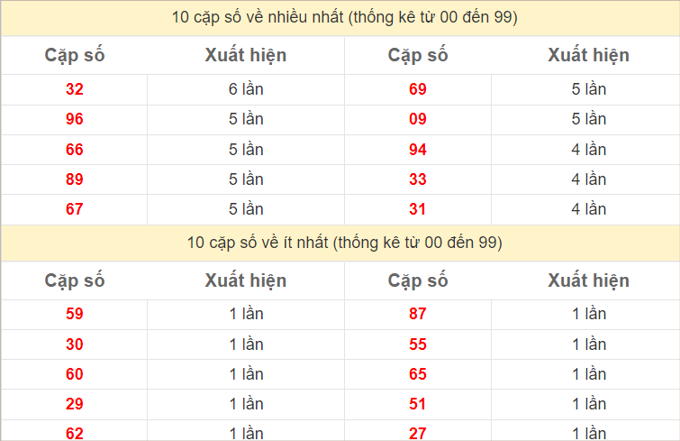 ⭐️ Thống kê tần suất lô về nhiều trong 30 ngày qua: 59 (17 lần), 66, 89 (15 lần), 76 (14 lần), 23, 94 (13 lần), 01, 32 (12 lần)
