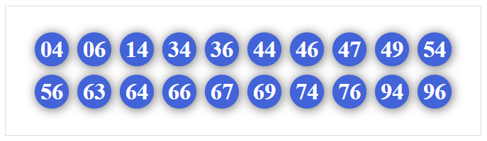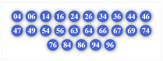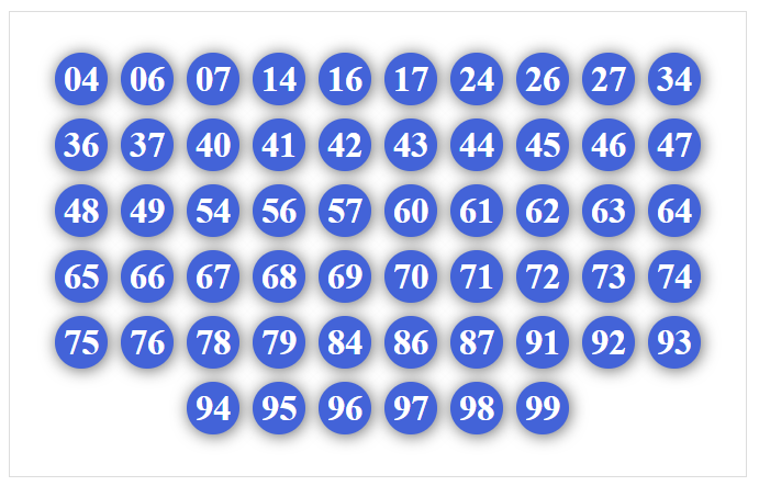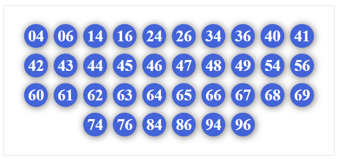 00, 01, 02, 03, 04, 05, 06, 07, 08, 09, 30, 31, 32, 33, 34, 35, 36, 37, 38, 39