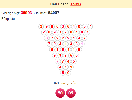 Kết quả từ soi cầu Pascale là cặp số may mắn: 05 50
