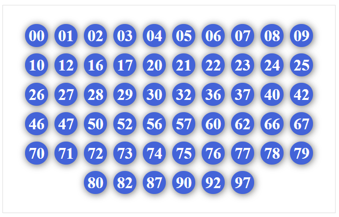 40, 41, 42, 43, 44, 45, 46, 47, 48, 49, 60, 61, 62, 63, 64, 65, 67, 68, 69, 80, 81, 82, 83, 84, 85, 86, 87, 89, 90, 91, 92, 93, 94, 95, 96, 97, 98