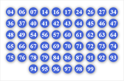 30, 31, 32, 34, 35, 36, 37, 38, 39, 50, 51, 52, 53, 54, 56, 57, 58, 59, 70, 71, 72, 73, 74, 75, 76, 78, 79, 90, 91, 92, 93, 94, 95, 96, 97, 98