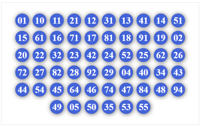 01, 02, 03, 04, 05, 06, 07, 08, 09, 40, 41, 42, 43, 45, 46, 47, 48, 49, 50, 51, 52, 53, 54, 56, 57, 58, 59, 80, 81, 82, 83, 84, 85, 86, 87, 89