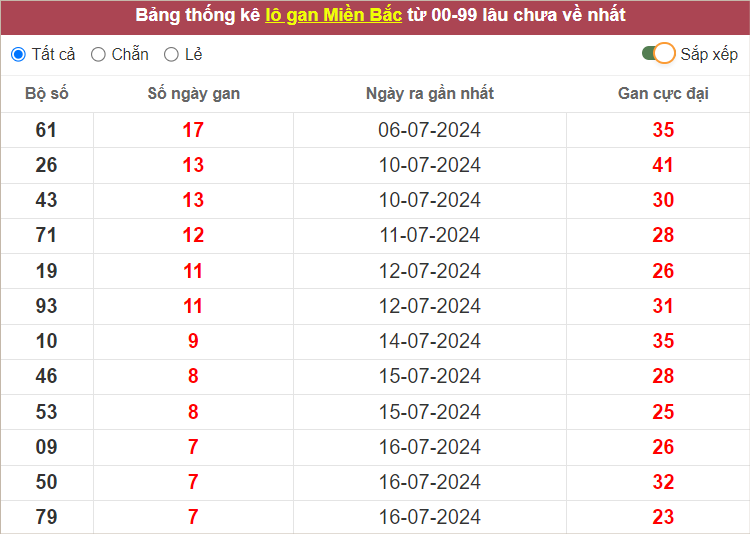⭐️ Lô gan MB lâu ra nhất: 61 – 26 – 43 – 71 – 19