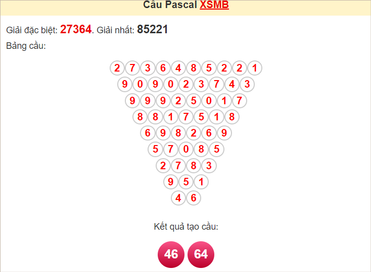 Kết quả từ soi cầu Pascale là cặp số may mắn: 46 64