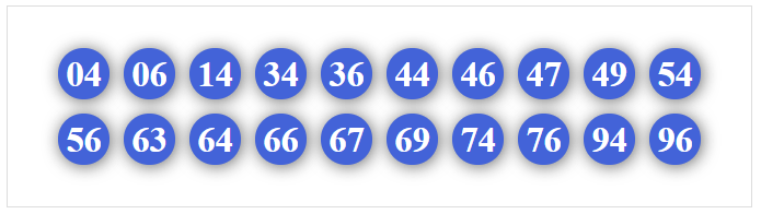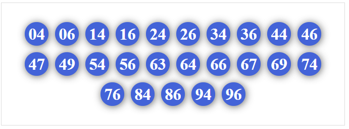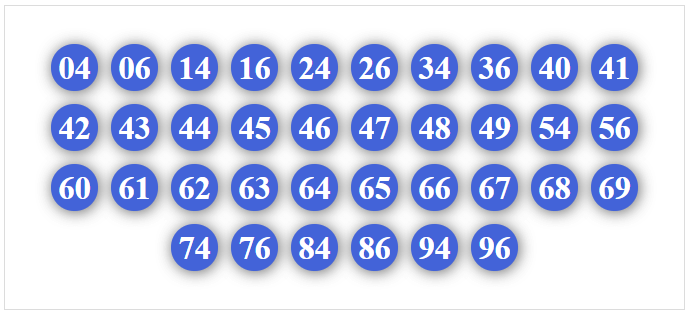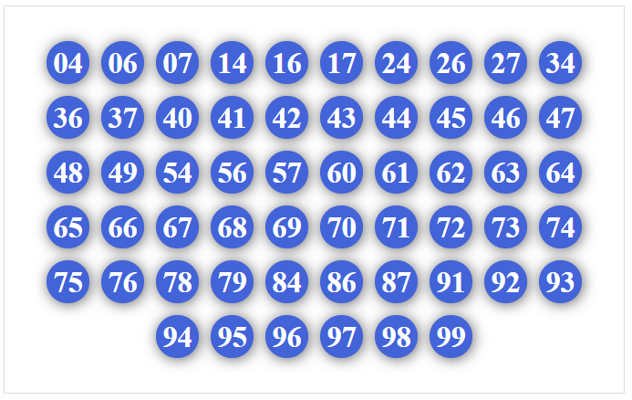 01, 02, 03, 04, 05, 06, 07, 08, 09, 10, 12, 13, 14, 15, 16, 17, 18, 19, 50, 51, 52, 53, 54, 56, 57, 58, 59, 90, 91, 92, 93, 94, 95, 96, 97, 98
