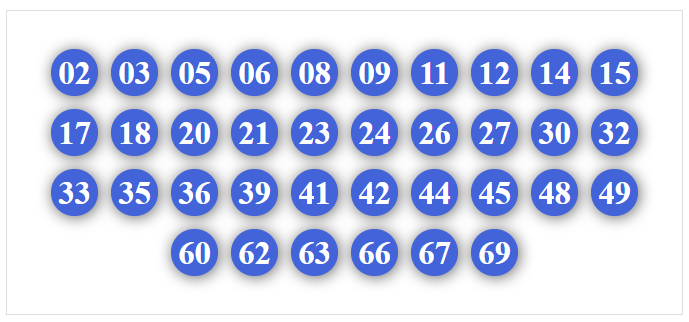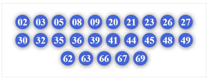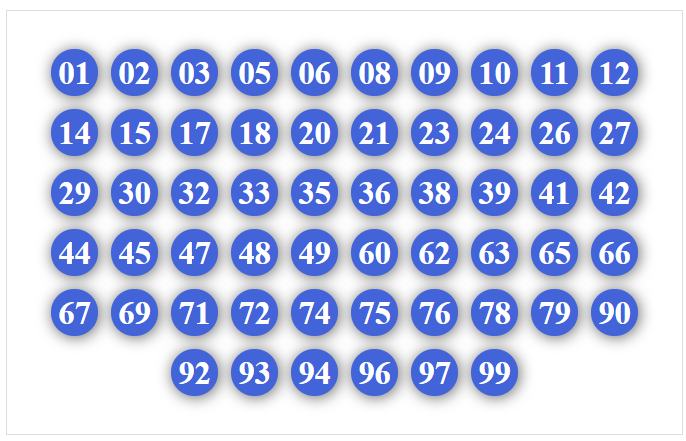 01, 02, 03, 04, 05, 06, 07, 08, 09, 10, 12, 13, 14, 15, 16, 17, 18, 19, 50, 51, 52, 53, 54, 56, 57, 58, 59, 80, 81, 82, 83, 84, 85, 86, 87, 89