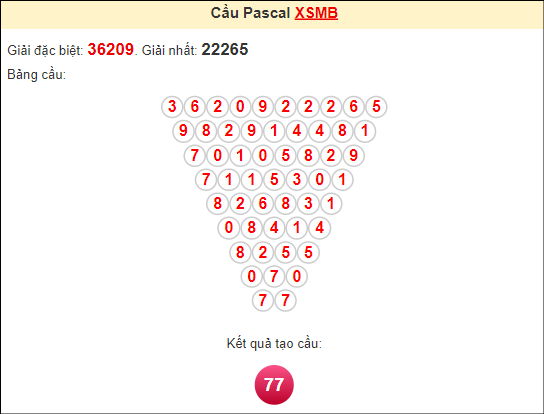Kết quả từ soi cầu Pascale là cặp số may mắn: 77