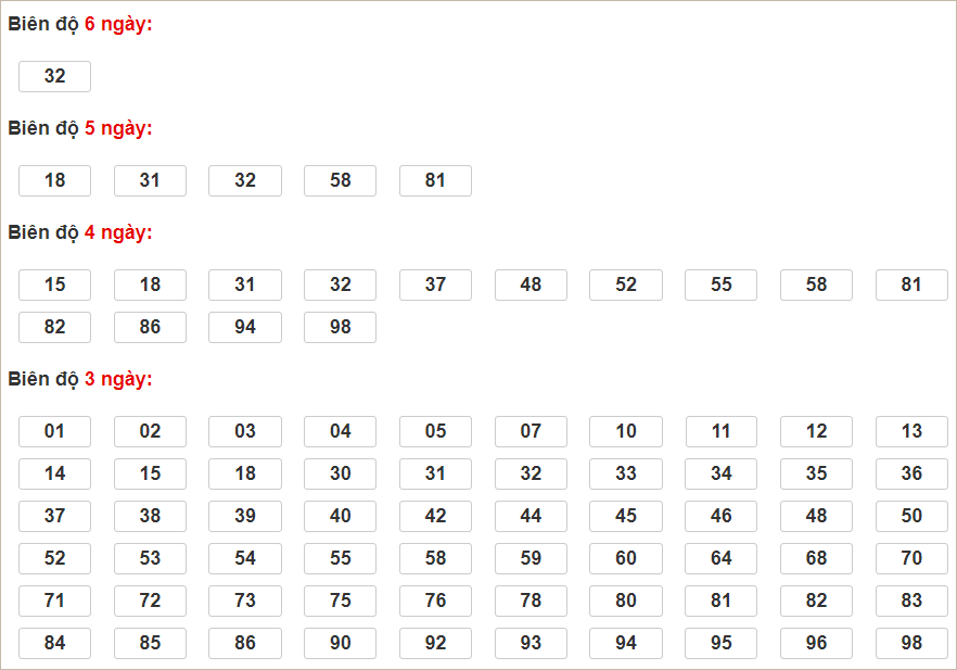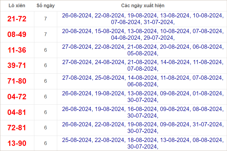 Cặp lô 16, 40, 44, 48, 54, 58, 71, 80, 86, 87 có độ dài 2 ngày.