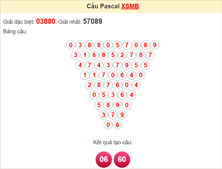 Kết quả từ soi cầu Pascale là cặp số may mắn: 06 60