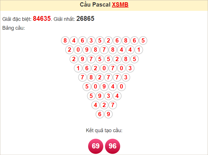 Kết quả từ soi cầu Pascale là cặp số may mắn: 69 96