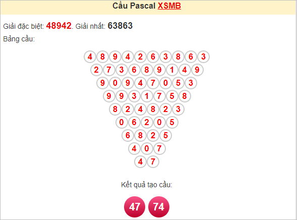 Kết quả từ soi cầu Pascale là cặp số may mắn: 47 74